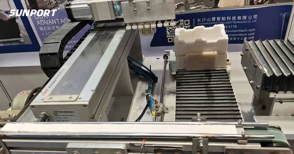 該設(shè)備由三軸機(jī)械臂、皮帶輸送機(jī)、撒砂機(jī)構(gòu)、送缽機(jī)構(gòu)組成。通過皮帶輸送機(jī)將粉末成型機(jī)上面壓制好的產(chǎn)品輸送至末端,通過三軸機(jī)械臂帶動(dòng)8工位真空吸盤(可一鍵換型),吸取或抓取產(chǎn)品放置匣缽內(nèi),放滿一層后,撒砂機(jī)構(gòu)將剛玉砂均勻的灑滿產(chǎn)品表面,然后繼續(xù)下一層的產(chǎn)品擺放,空/滿匣缽可自動(dòng)收放。通過此設(shè)備,陶瓷塊裝盒由人工向自動(dòng)化的轉(zhuǎn)變,大幅提高作業(yè)效率,減少人工作業(yè)強(qiáng)度。